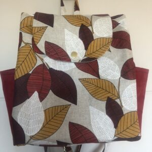 Sac à dos en coton enduit gris clair et faux cuir. Motif ginko biloba Sangles réglables, deux poches extérieures et 4 à l’intérieur. Doublure en coton enduit noir à petit pois blanc.