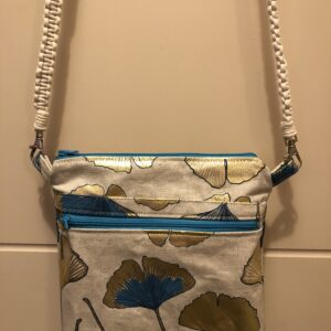 Sac bandoulière en coton enduit motif ginko biloba. Une poche extérieure zippée et une intérieure. Anse réglable. Doublé de coton enduit.