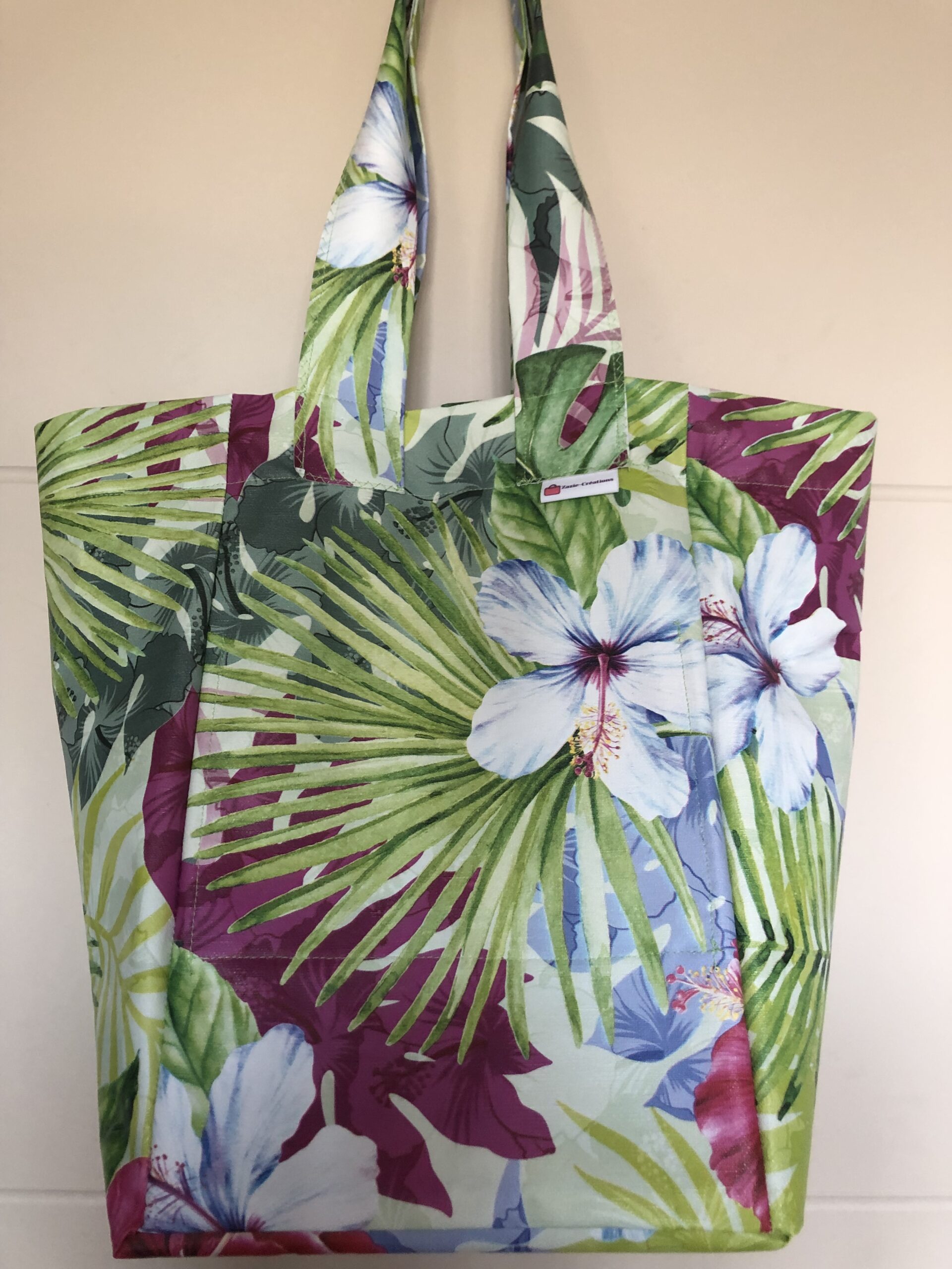 Coton imprimé et doublure à fleurs. Fermeture et poches intérieures. A porter en bandoulière ou à la main. Très léger.