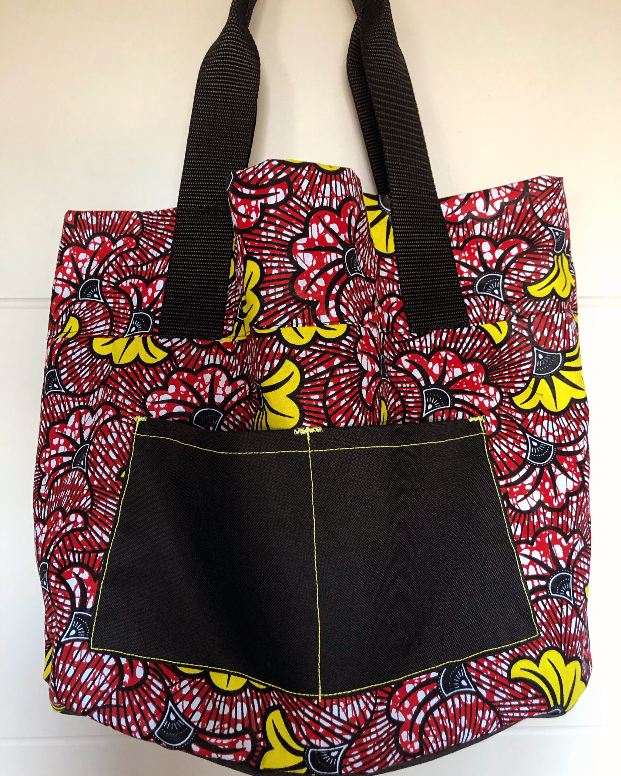 Grand cabas en tissu wax rouge et jaune pur coton.