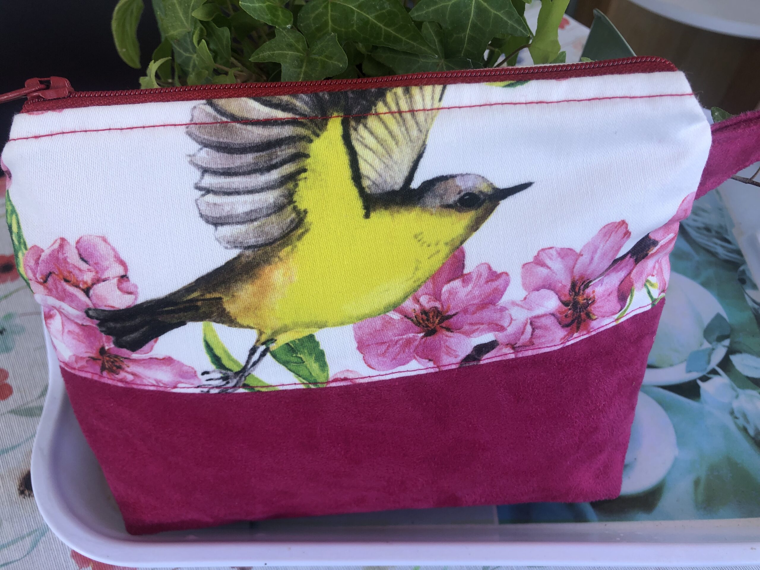 Coton imprimé et doublure à fleurs. Fermeture et poches intérieures. A porter en bandoulière ou à la main. Très léger.